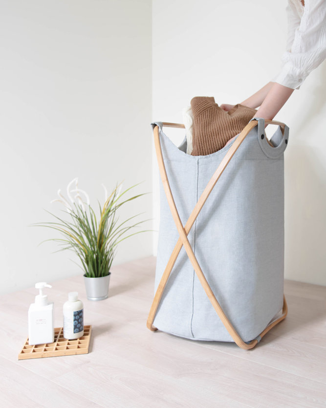 The classic X-frame hamper looks elegant, but could it be more convenient to take and go? We heard you! The new version of BUTTERFLY is ideal to take along as a shoulder bag to laundromat. Simply unload the strap from bamboo frame and it becomes a large outdoor bag. Its capacity can store up to 100L clothing. We have also upgraded the bag, the water-repellent fabric on the inside protects against moisture. Dirt can be easily wiped off with a wet cloth.