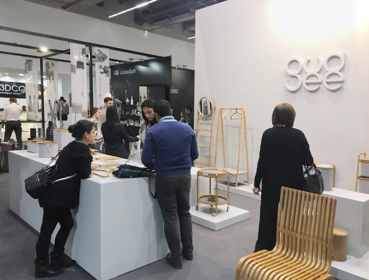 More than 20 products are shown by Gudee in Ambiente fair. The booth is design with light grey to harmonize the nature colors of our products and shows the simple lifestyle we aim for. Inviting simplicity and nature into furniture and home accessories is currently on-trend. Visitors also find our package design very concise and eye-catching.