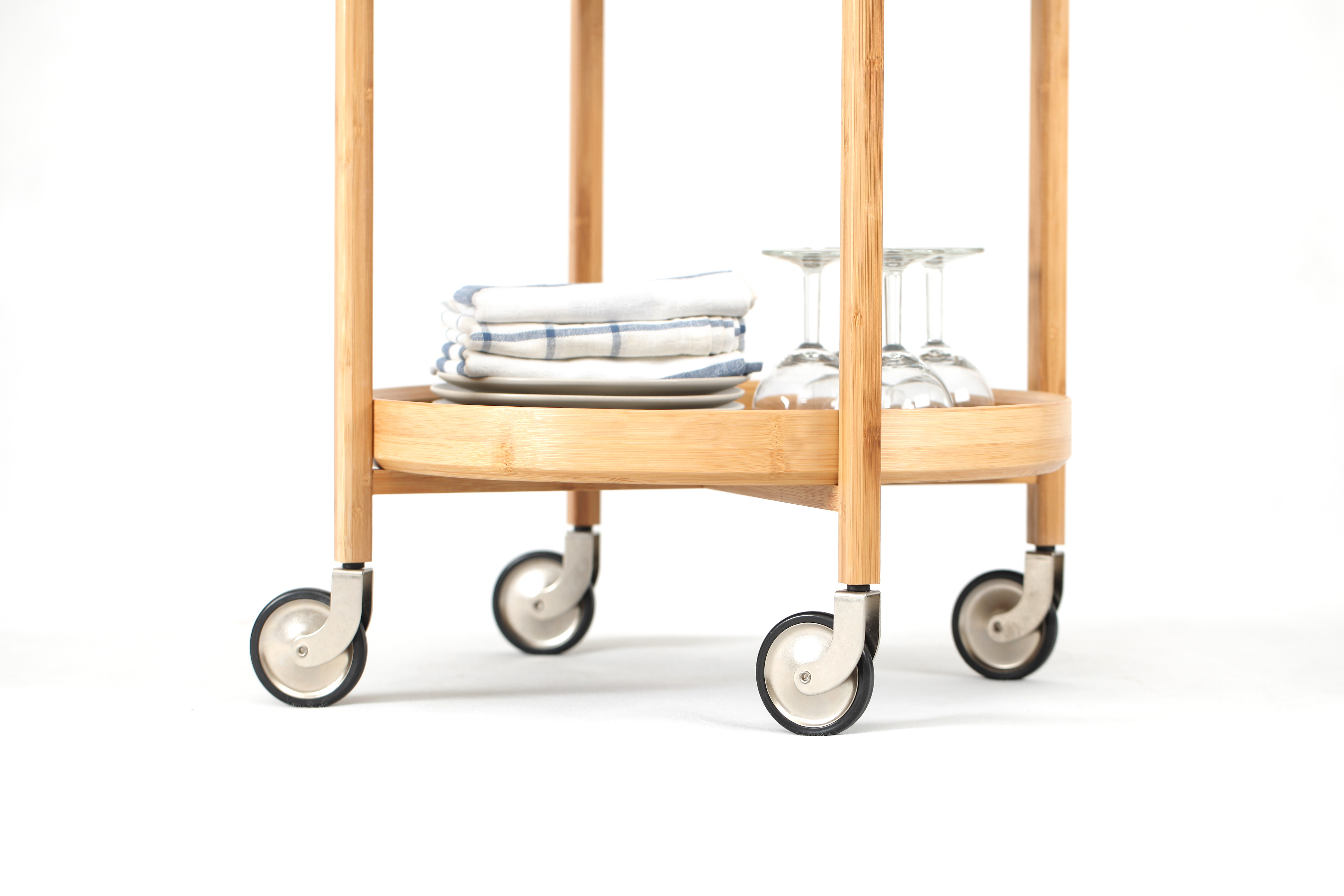 Delicate bamboo contour and round shape are the features in ROCA cart. Light color of natural bamboo gives you fresh and relaxed atmosphere. You would be surprised how it fits easily in your living room, kitchen and bedroom.