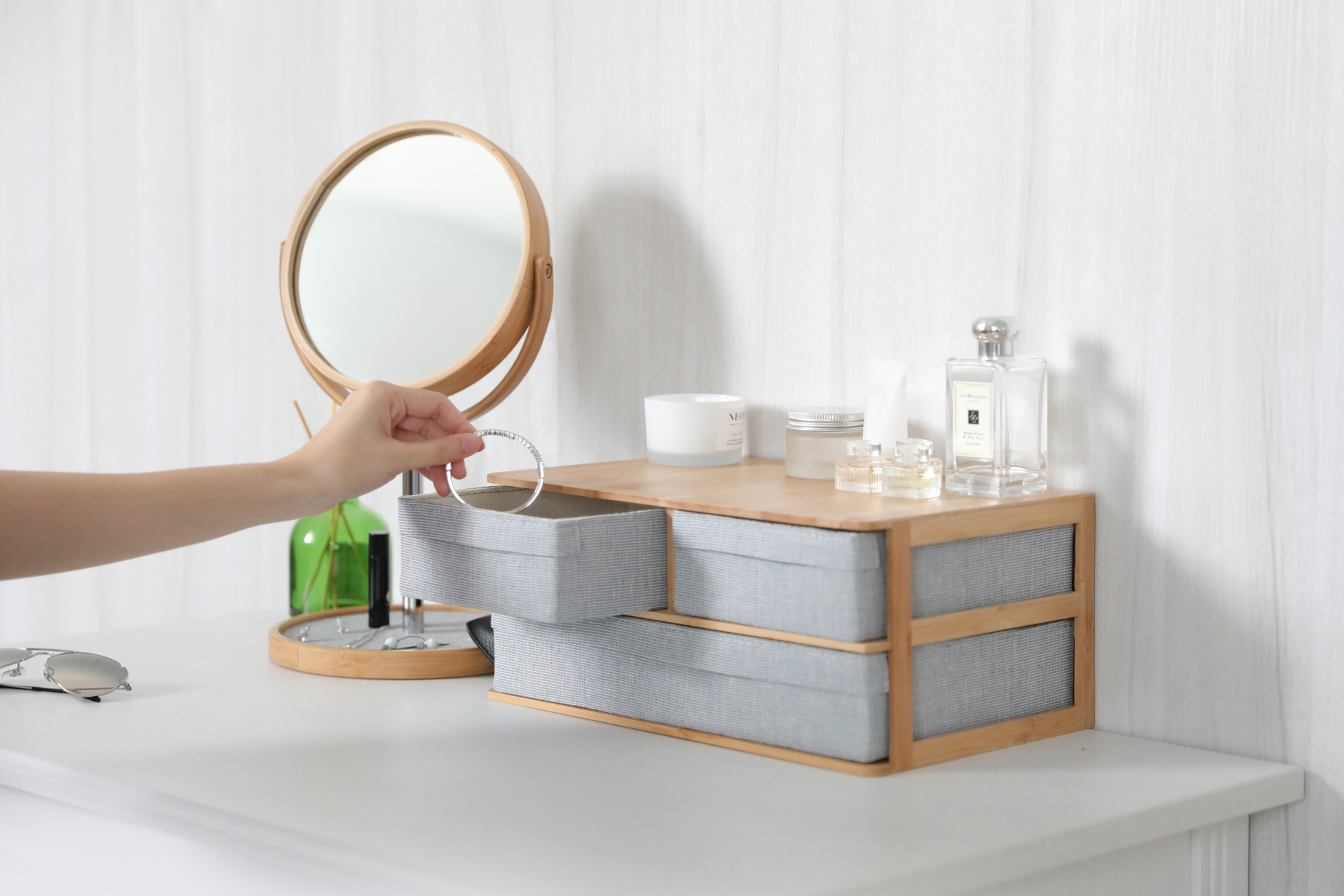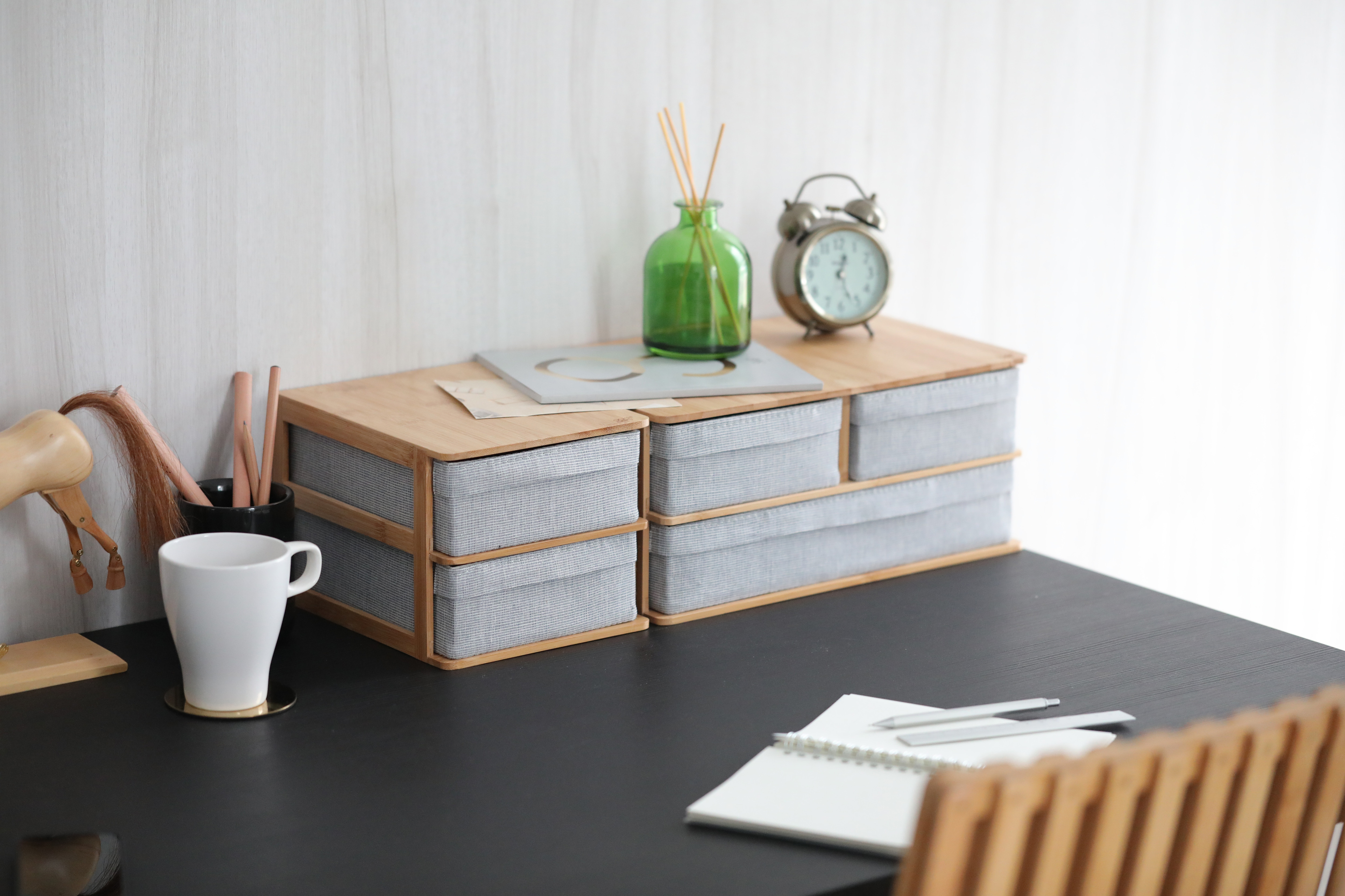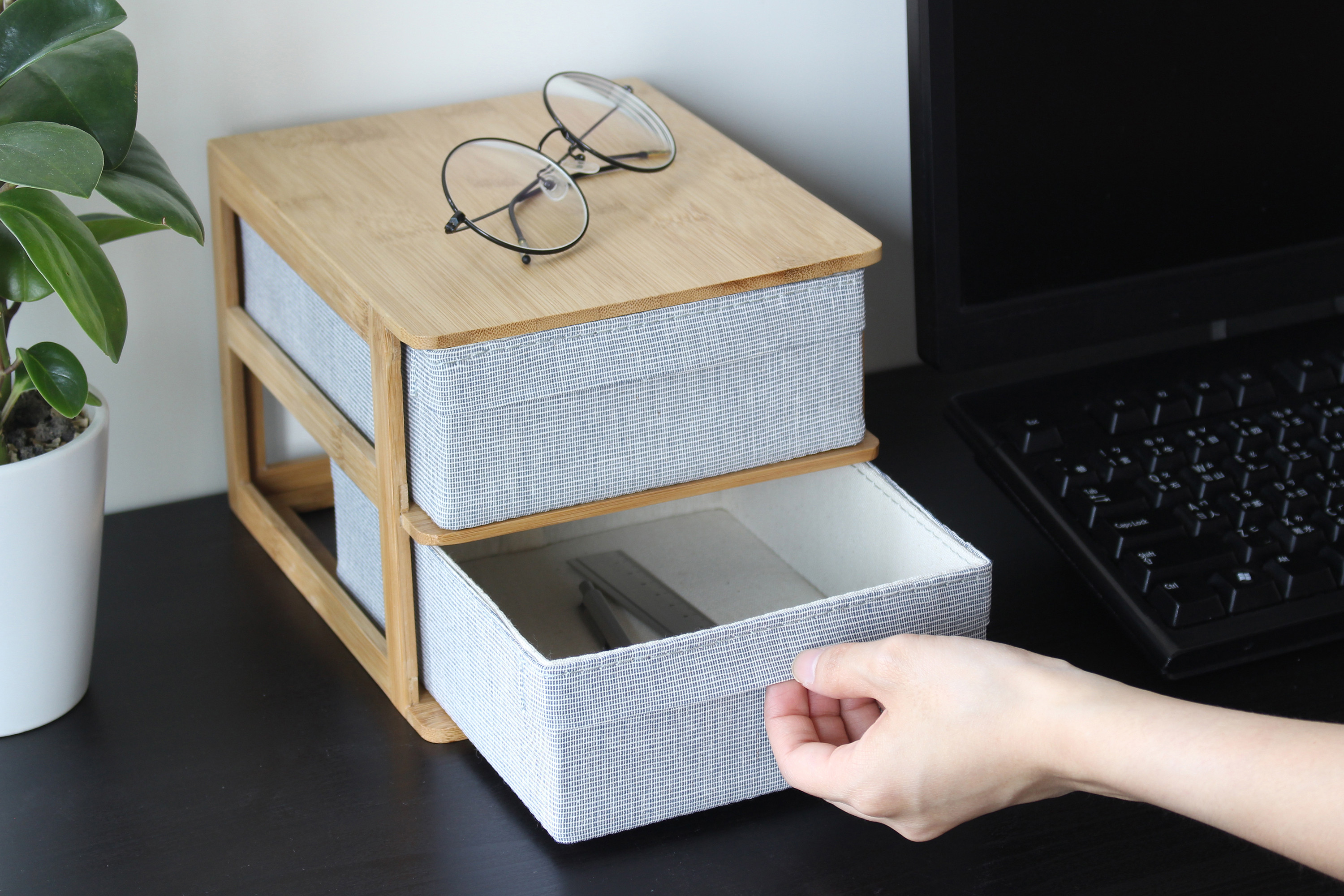 從2019年起,Gudee好迪家居為大家帶來兩款桌上抽屜收納櫃,規格分別是兩格與三格。精緻的竹製結構讓其穩固耐用,並為書桌添了一些自然的氣息。而抽屜採用較為堅挺的布料保護抽屜的日常使用。