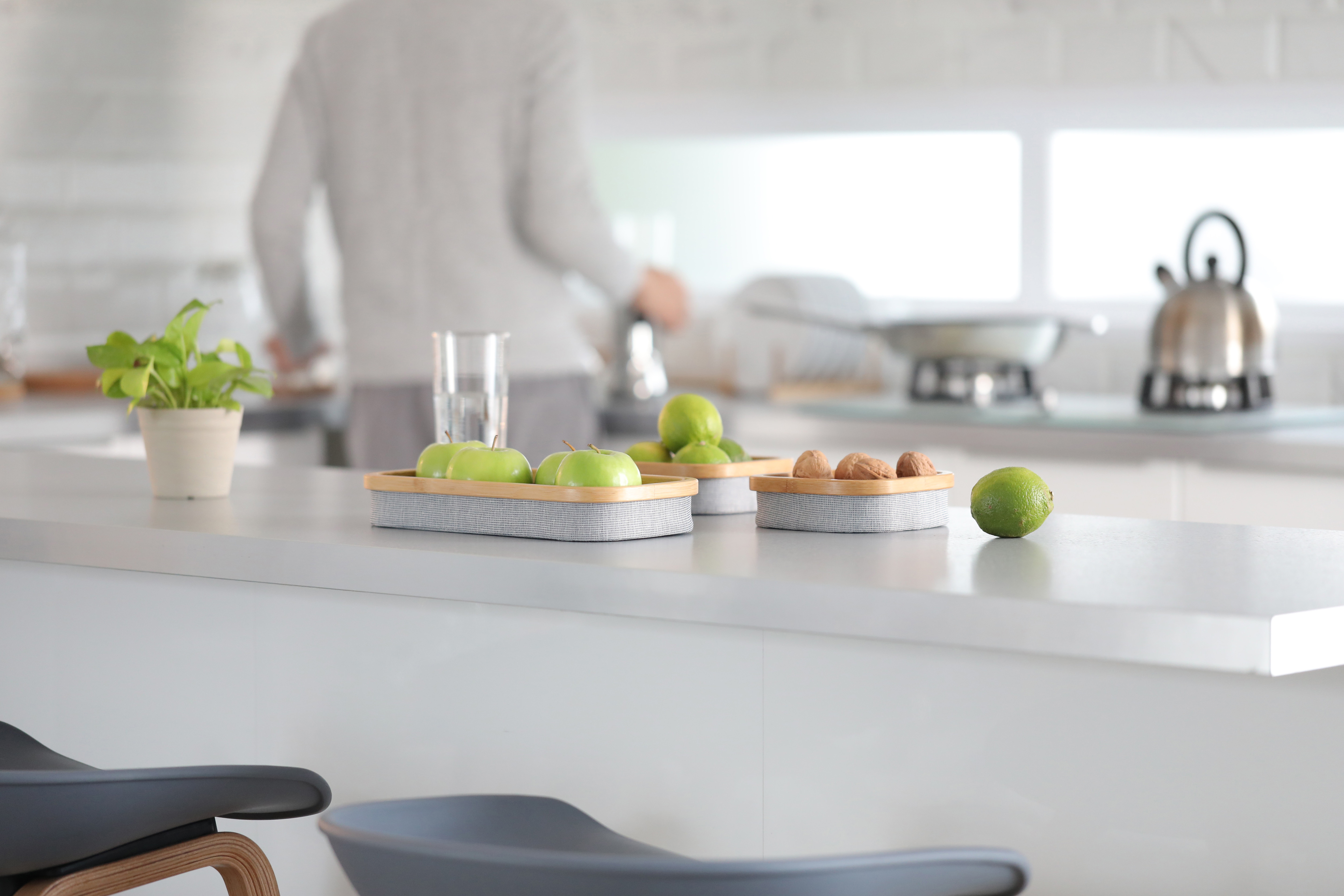 At kitchen bar, WALT serves as snack tray and fruit bowl. Nature bamboo color matches light grey fabric container, which brings out the food even more delighted. The uses of this tray are endless. Holder for key, tv remote control, scented dried flower and more, you name it!