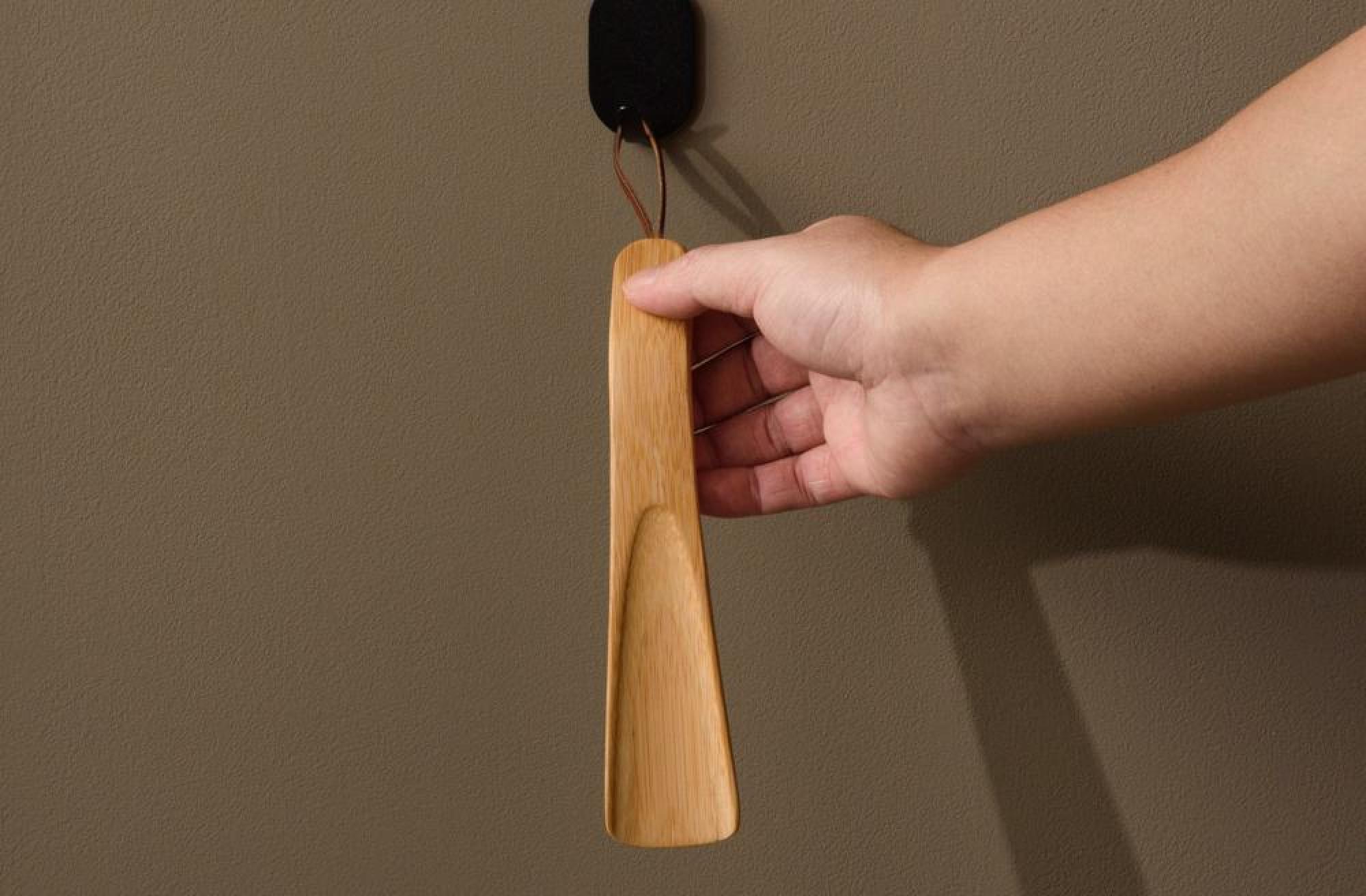 The heat-pressed bamboo handle features a gently curved end, designed to fit naturally in the palm and allow controlled, comfortable force when putting on shoes.