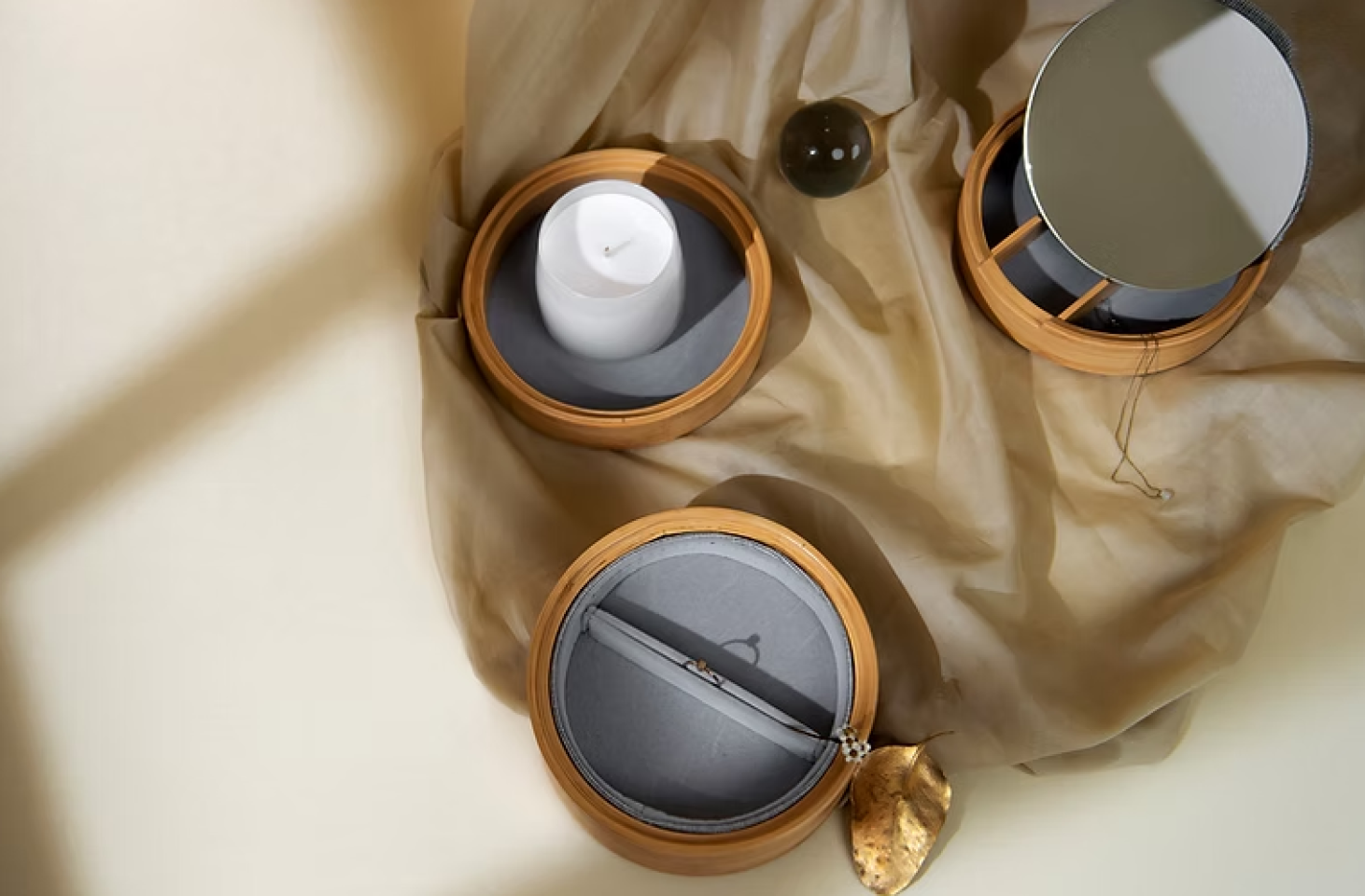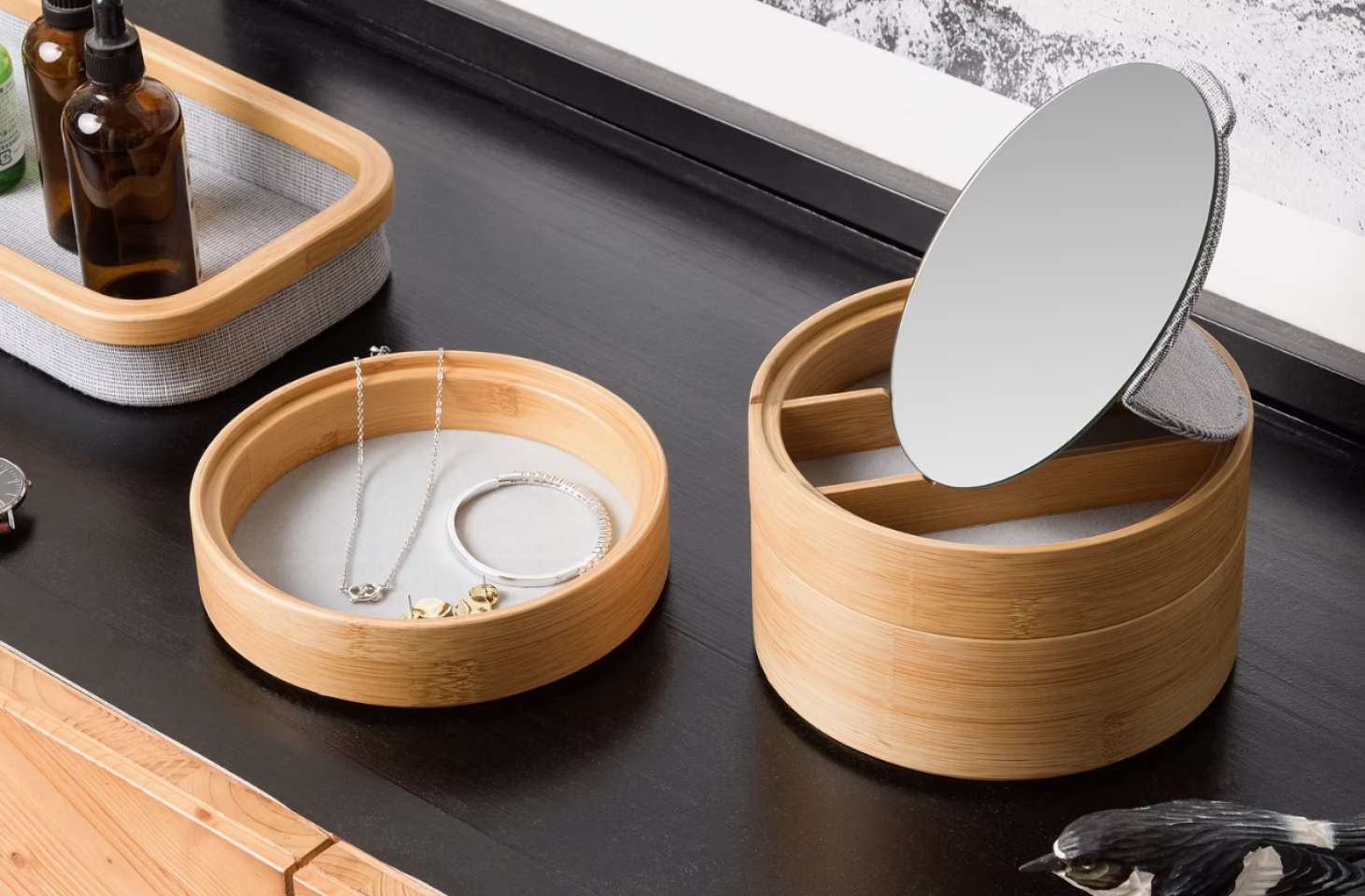 Double-layer jewelry box provides you efficient way to store your small trinkets. There is a mirror on top layer. Ring tray is set at the bottom layer. Bamboo made box is elegant and lightweight. Additional storage tray is also available to add on easily as your collection grows.