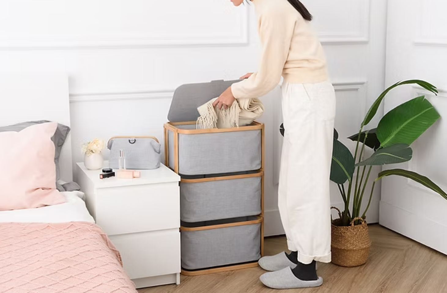 This contemporary piece brings a modern look to home storage. CELIA comes with 3-unit drawers made of bamboo and fabric. There is one compartment under the lift-up lid to store against dust. Two handy drawers are at the bottom. It is a lightweight, sturdy and functional solution for bedroom, living room or any home space.
