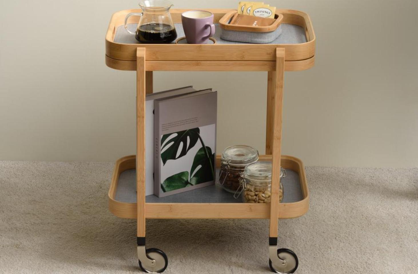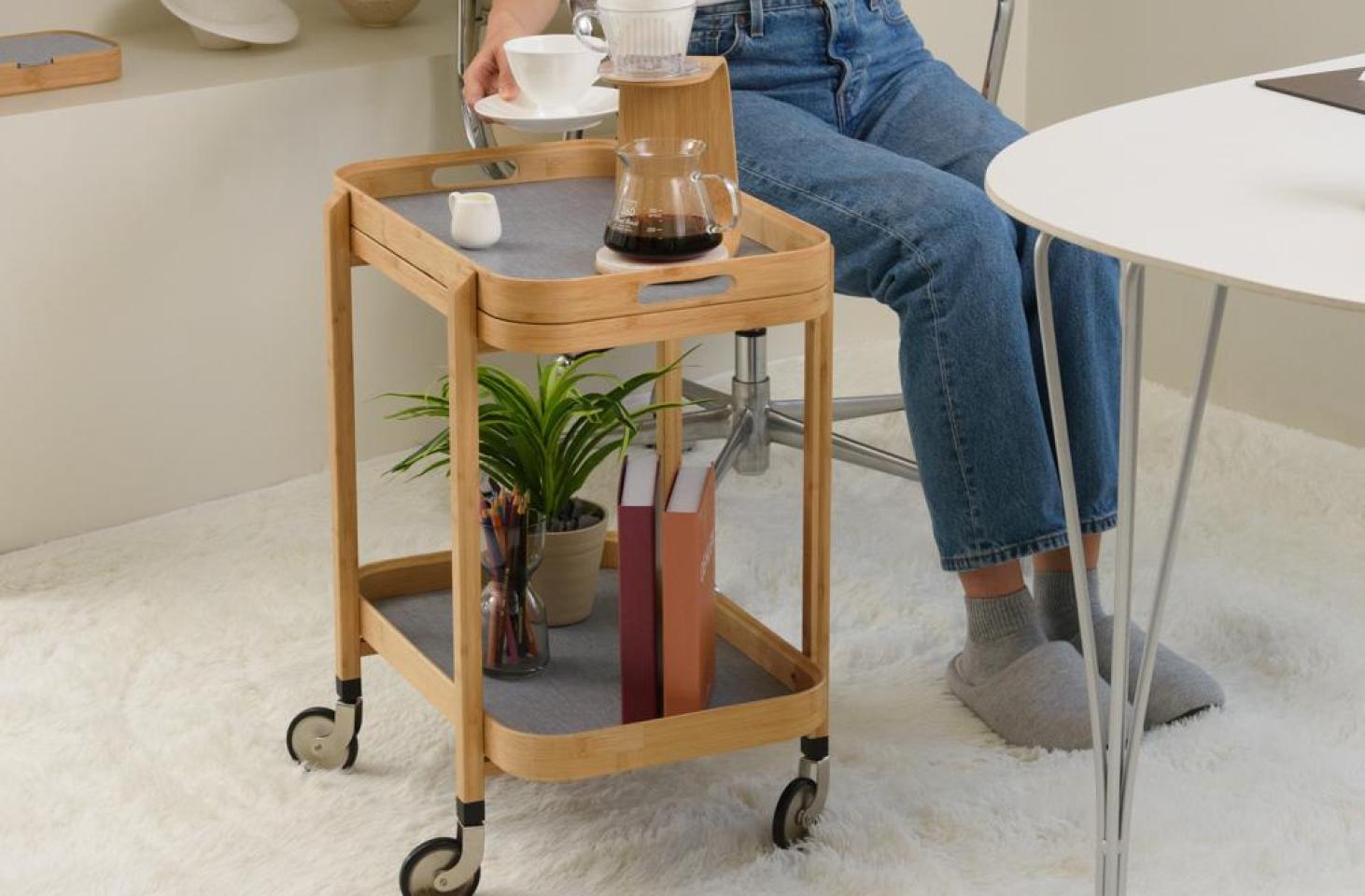 ROCA cart is made of high quality bamboo, and it offers a smooth surface for your favorite spirits. With two tiers of storage trays and four wheels, it is a flexible piece that can move around in your home. The topper tray is detachable. The arch of bamboo frame gives Roca a simple structure that makes it stylish