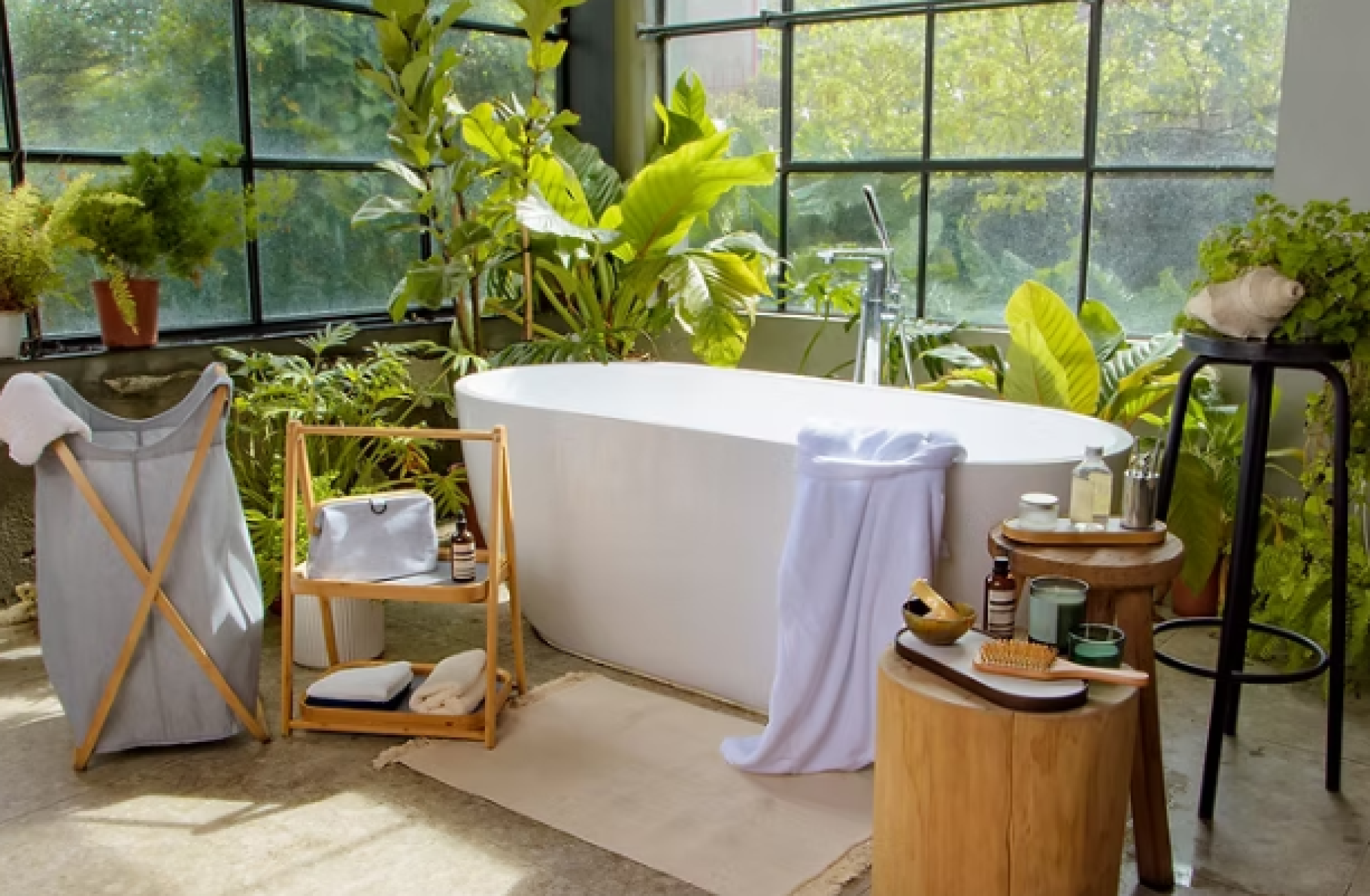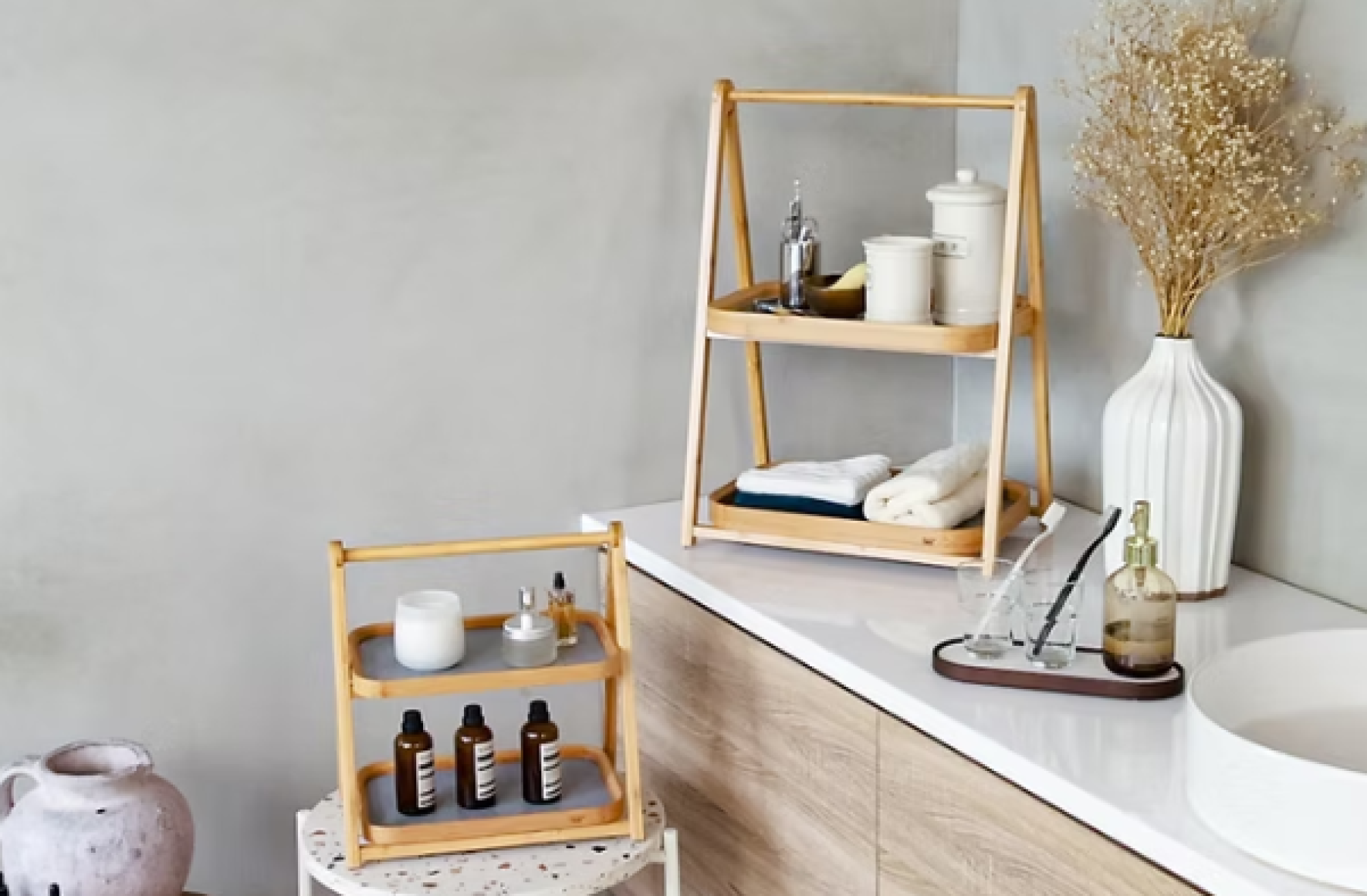 Complete your comfy bathroom with a bamboo freestanding rack. Take advantage of unused corners. Store your bath towels within reach. Two level design lets you place body cleanser, shampoo, body balm, fragrance on top tray or drying towels on bottom tray. It is foldable when not in use. No tools required for assembly.