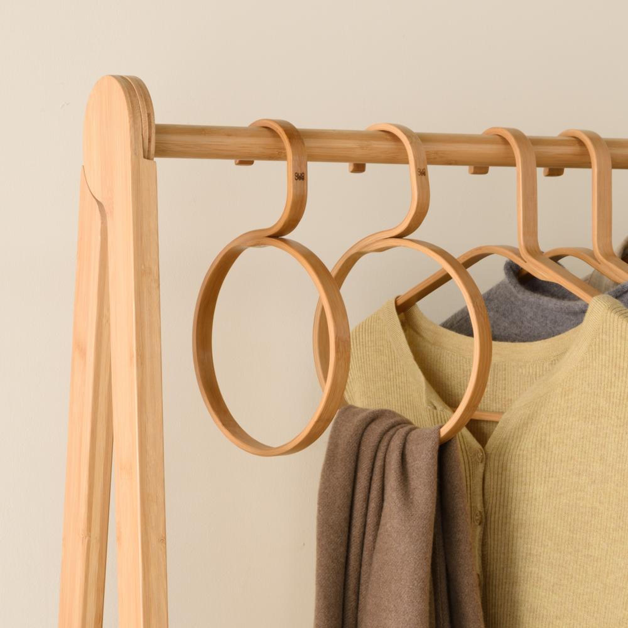 Classy and practical, this hanger beautifully shows off your favorite scarves, belts, ties and other accessories. The circle for hanging is 16 cm in diameter. Superior solid bamboo is perfect for your garment rack. It is light and easy to use