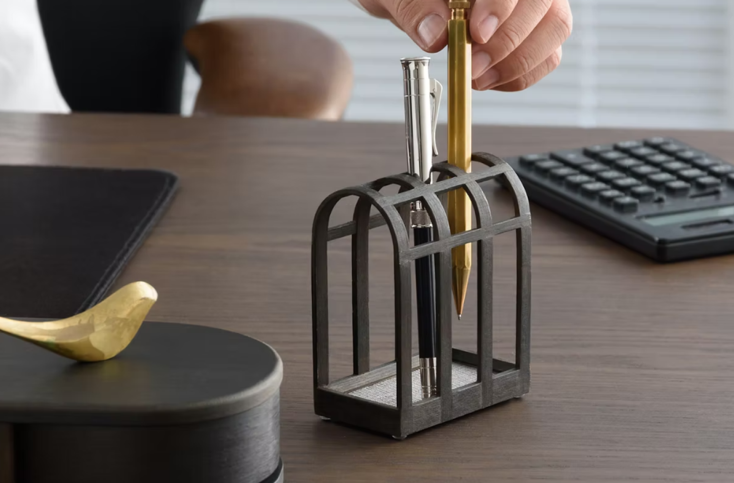 brings style to your desktop. Soften the look of a conventional workplace storage by adding an arch to the top. This bamboo pen holder provides 9 holes for essential pens and pencils, instead of collecting all your writing implements in the office.