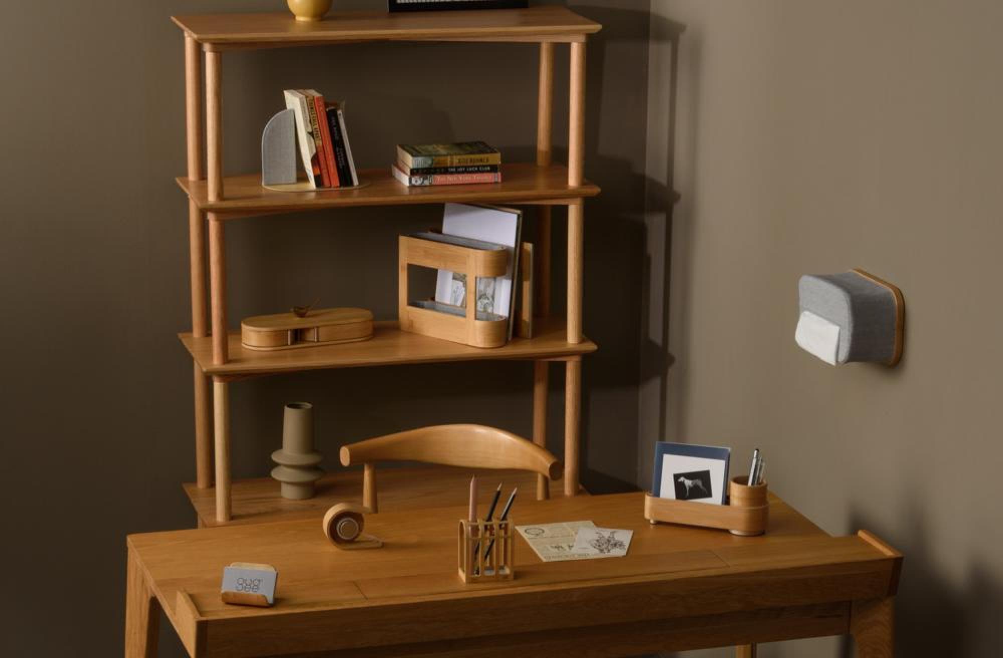 Discover this interesting way to open a desktop storage. The rotating drawers combine minimalist simplicity with functional storage. Brass/aluminum drawer pulls add a touch of glamour on brown bamboo case. ORSON desktop storage is ideal for storing stationery or small gadgets.